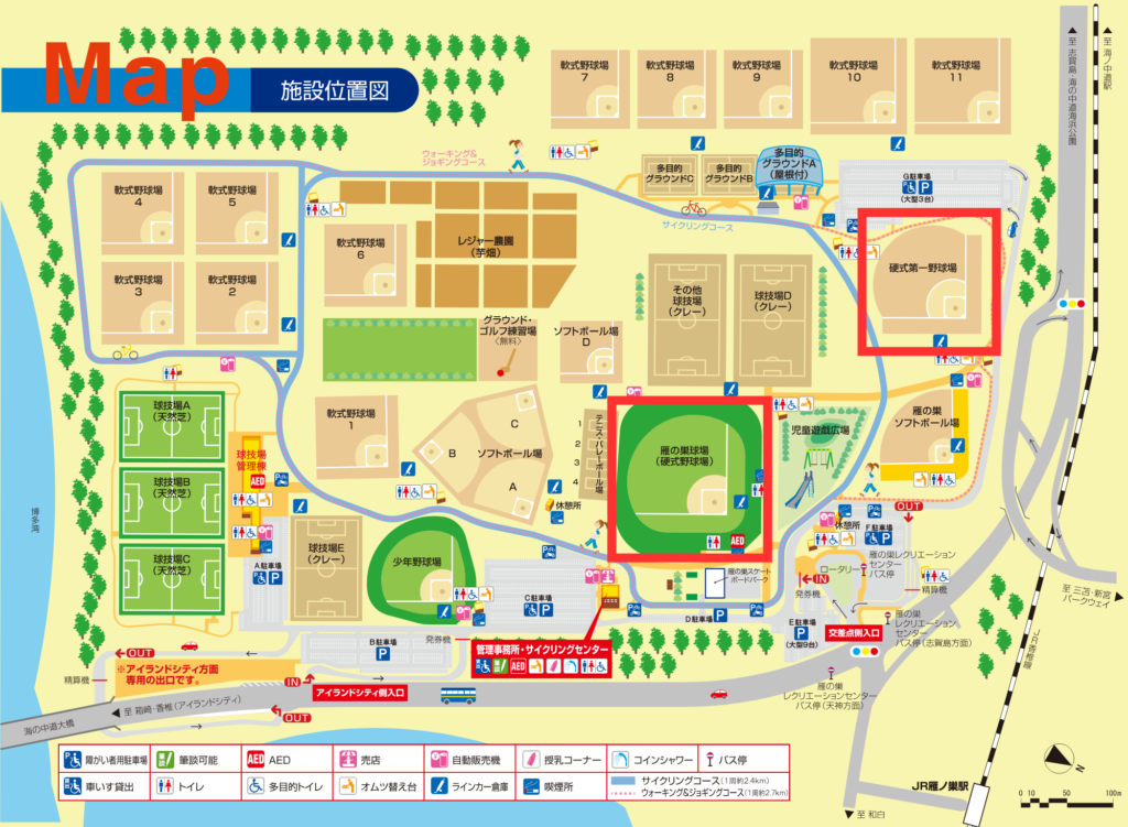 【両翼】 98m【中堅】 122m【外野】 天然芝【内野】 黒土【バックスタンド】 458席【内野・外野スタンド】 芝生席【利用】 平成26年まで、福岡ソフトバンクホークスがファームの本拠地として利用していました。現在は一般開放されており、野球(硬式・軟式)やソフトボールのご利用が可能です。
